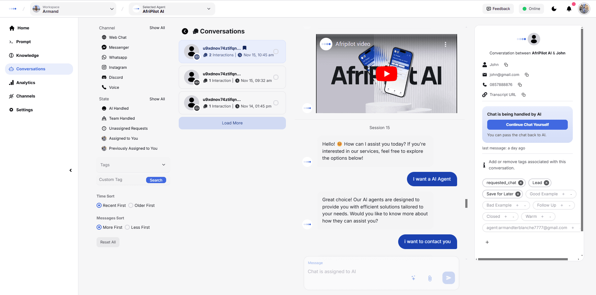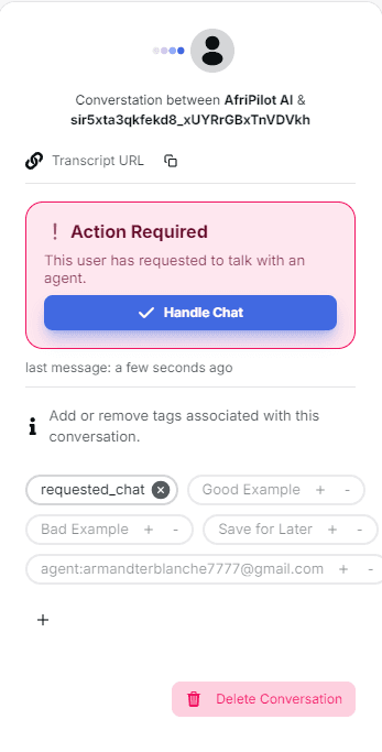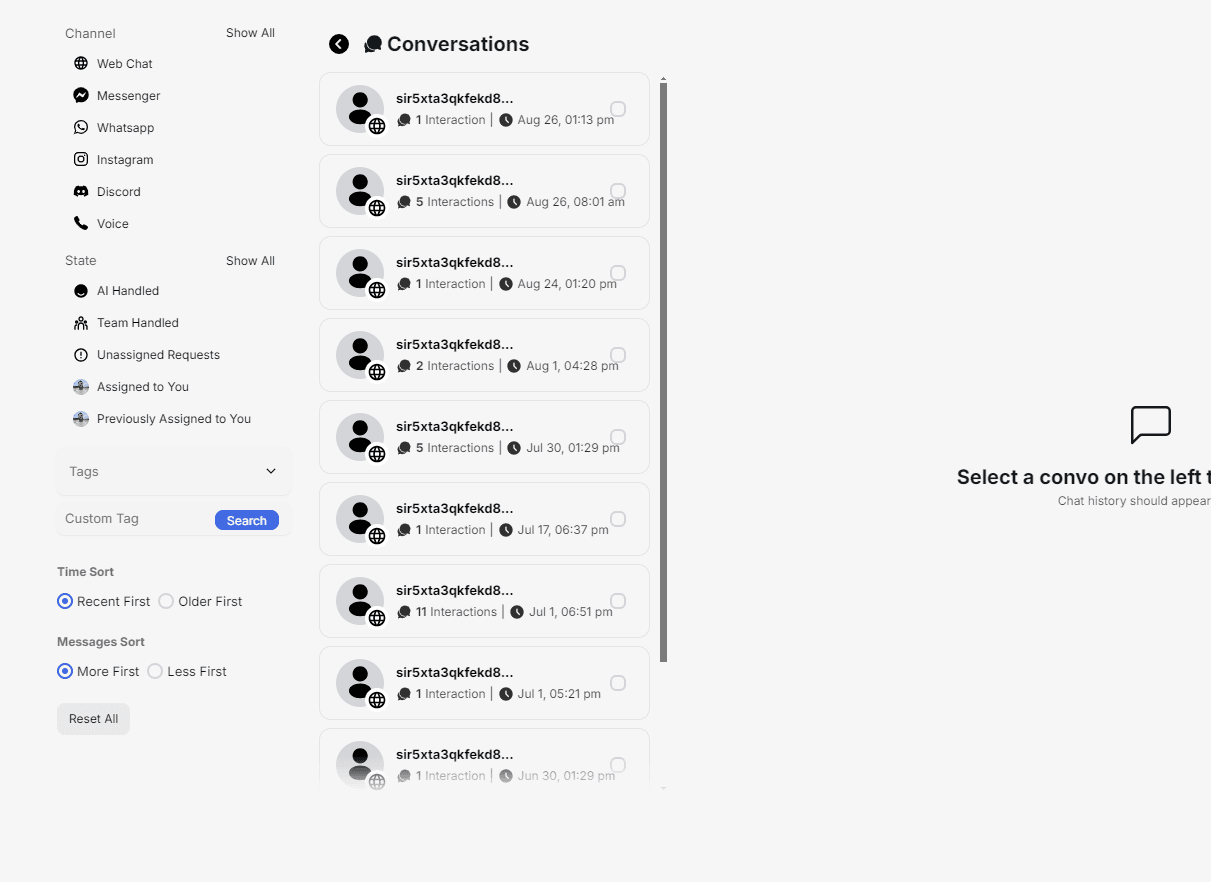 Get real-time insights into live chats, access detailed chat histories, and smoothly transition conversations between AI and human agents for optimal customer support.
