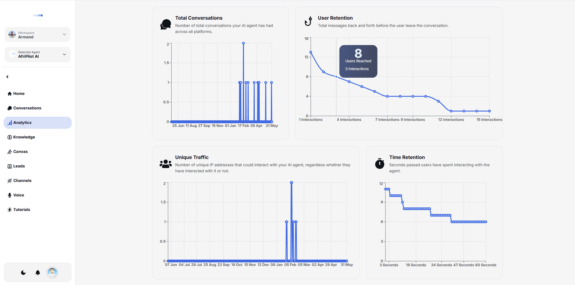 Monitor in realtime the sessions your Agent is having with each user across many channels.